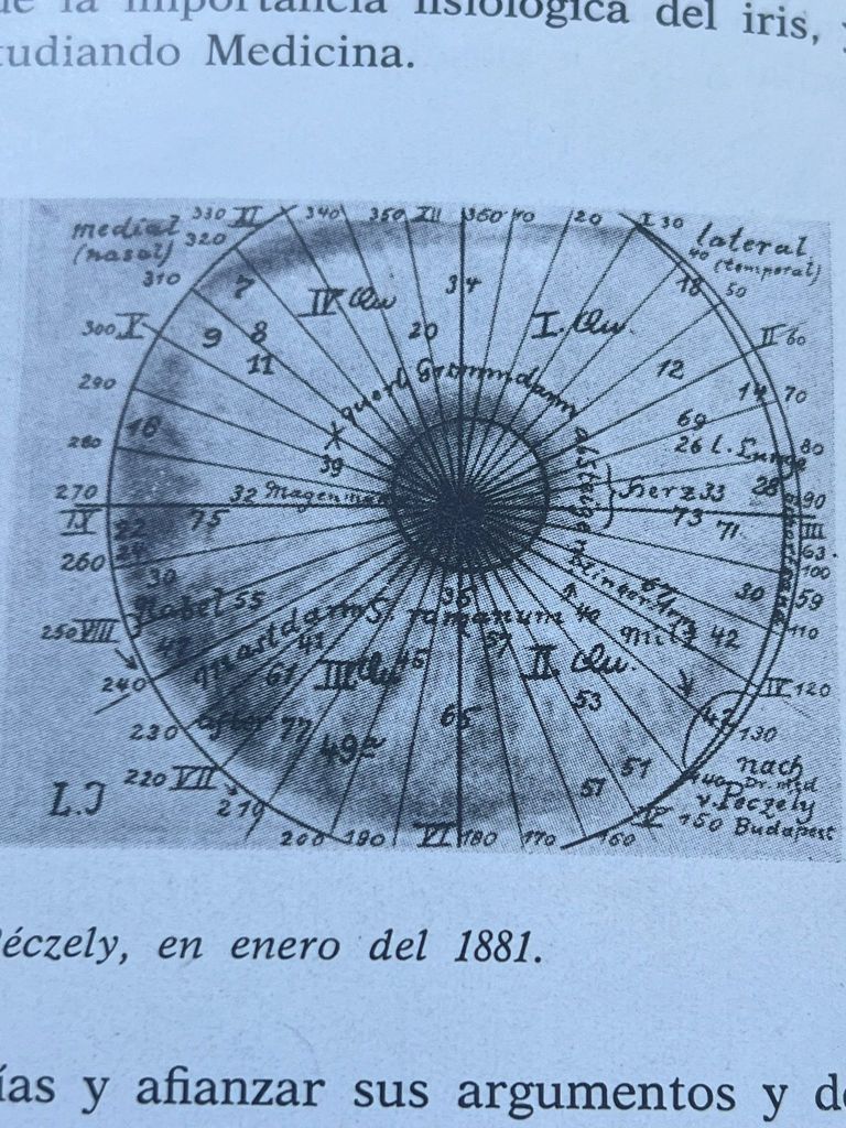 Años después Peczely estudió medicina y al recordar la experiencia que había vivido de niño, empezó a observar los iris de los pacientes que entraban a quirófano. Así pudo observar en los iris humanos, lo mismo que había visto en el del búho años atrás, unas manchas negras que aparecían súbitamente justo en el momento de la cirugía y que más tarde se volverían blancas. Así Peczely consiguió hacer el primer gráfico del iris.